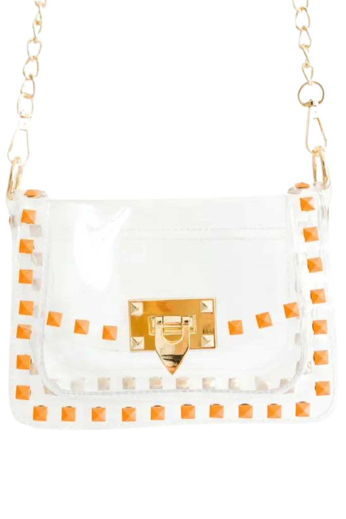 Score with the biggest winner in our clear handbag playbook - The Jackie! The Jackie changed the handbag game by proving clear handbags could be both functional and chic. This style includes royal blue square metal studs and a gold chain. The Jackie is NCAA and NFL compliant and the ideal size to hold your wallet, phone, keys, lip gloss, and a few other small items.