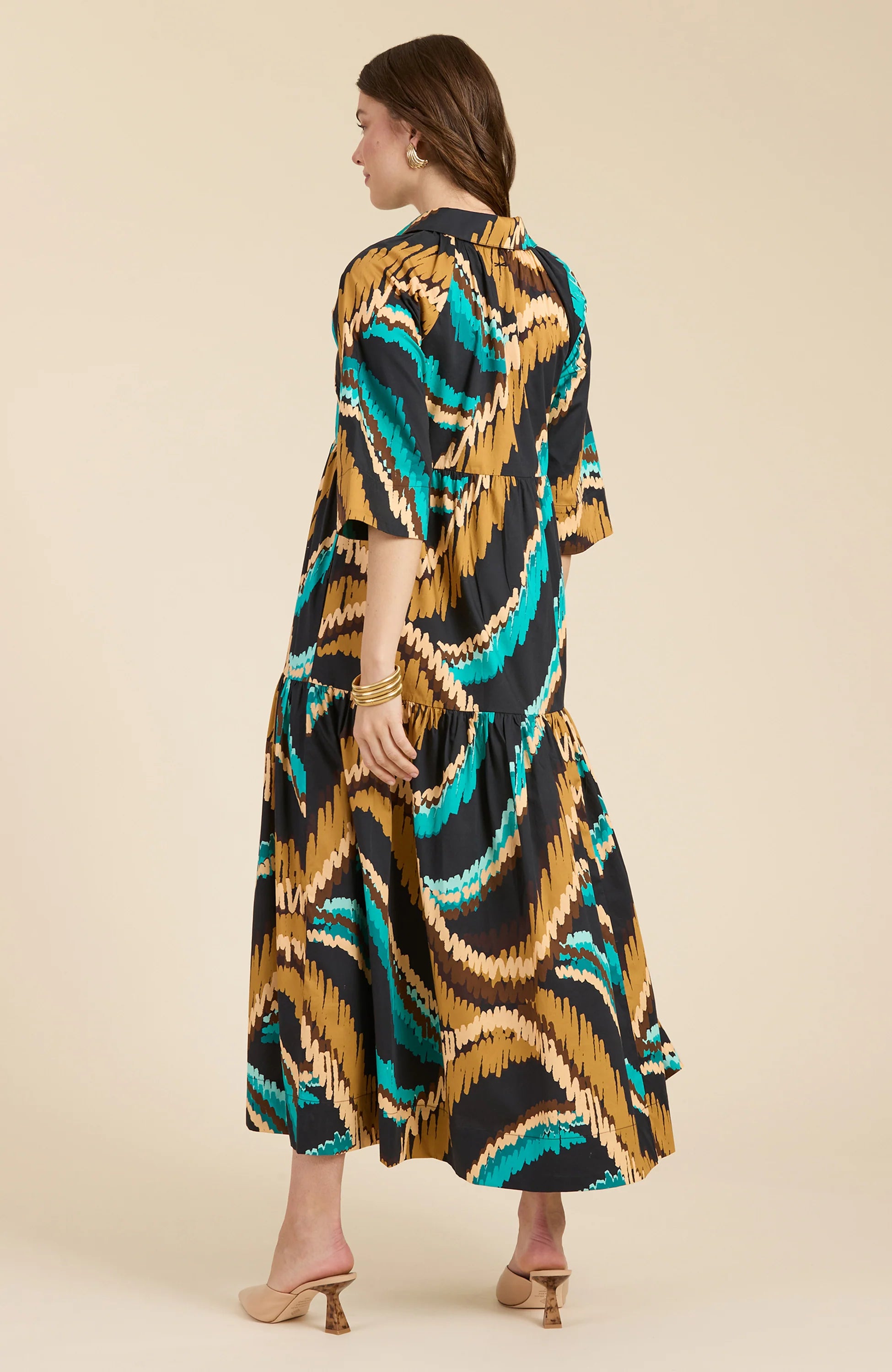 This cotton midi dress features an A-line silhouette, flattering collared v-neckline and everyday-elegant tiers. In a retro, multi-color print, this dress can be transitioned into multiple seasons.